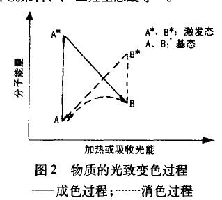 可逆的光致變色過程分為成色與消色,如圖2所示。物質(zhì)A 吸收光子hvl,從基態(tài)躍遷到激發(fā)態(tài),然后發(fā)生光化學反應,變?yōu)?B物質(zhì),這是成色過程;B物質(zhì)吸收光子hv2或吸收熱,發(fā)生熱變反應,由基態(tài)直接變?yōu)锳物質(zhì)或由基態(tài)躍遷到激發(fā)態(tài),發(fā)生光變色反應,再回到物質(zhì)A,這是消色過程。光致變色的有機物可分為光氧化還原型化合物和光異化化合物,發(fā)生的現(xiàn)象有:順式轉(zhuǎn)變異性化現(xiàn)象;互變異性化即H移動現(xiàn)象;異質(zhì)解裂即離子解離現(xiàn)象;同質(zhì)解裂即游離基的解離現(xiàn)象;光氧化還原現(xiàn)象和開環(huán)、閉環(huán)現(xiàn)象。常見的光致變色材料有偶氮染料和靛類染料、螺環(huán)苯并吡喃、三芳甲烷染料、l,4一二羥基葸醌等。