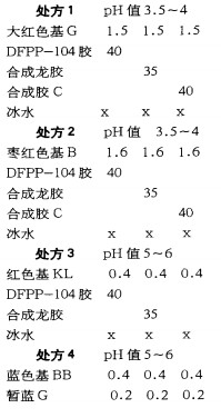首先配制冰漿染料,采用合成膠C制糊,濃度為5%,冰水攪拌1.5h后,呈透明的淺棕色,懸棒滴降呈線狀即可;用溫熱水攪拌1h,使用原糊時應先用冰醋酸調(diào)節(jié)pH值4~5。使用相同的原料,且都在同樣的承印物上印刷,可以采用以下幾種冰漿印花工藝。