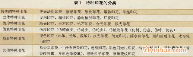 帶有一些特殊效果的印花紡織品統(tǒng)稱為特種印花。例如在紡織品上印上產(chǎn)生變色效果的花型稱為變色印花,在紡織品上印上有珠光的花型稱為仿珍印花,在紡 織品上印上有凸出立體感的花型稱為發(fā)泡印花等等。特種印花按印花工藝論,絕大多數(shù)屬于直接印花,按印花色漿,絕大多數(shù)相似于涂料印花色漿,因此特種印花的工藝較簡單,但它的材料和漿料技術(shù)含量較高,它能在各種織物(纖維)上印花。根據(jù)特種印花的發(fā)展和特殊效果的歸類,大致可分為六大類,見表1。