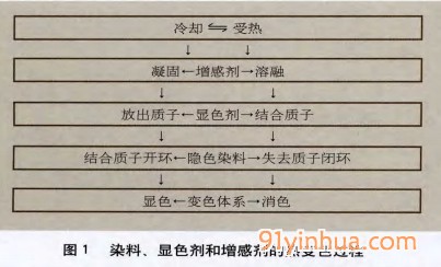 有機(jī)熱敏變色體系至少由染料、顯色劑和增感劑三部分組成,三者的配伍性要好,為了達(dá)到明顯的變色效果,染料內(nèi)酯的開環(huán)和閉環(huán)應(yīng)保持平衡狀態(tài),其分子重排的活化能應(yīng)很低,這樣才有高的熱靈敏性。染料、顯色劑和增感劑的熱變過程可用圖1表示。