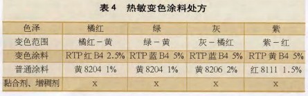 2)熱敏變色印花的工藝流程及處方工藝流程(印花有哪些工藝):熱敏變色涂料在紡織品上的印花主要是采用微膠囊化技術(shù),因此,其印花工藝基本上與普通涂料印花工藝一樣,其流程為:印花(100網(wǎng)目)一烘干(100℃)一焙烘(150℃,3min)一整理一成品印花處方見表4。