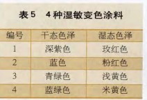 1)濕敏變色有機(jī)涂料的組成濕敏變色有機(jī)涂料主要由濕敏變色染料、敏化劑、黏合劑和增稠劑組成,也是可逆性變色,當(dāng)空氣環(huán)境濕度達(dá)到一定值時(shí),濕敏變色體的分子結(jié)構(gòu)發(fā)生變化,從而改變?nèi)展庵胁糠挚梢姽獾奈展庾V,導(dǎo)致色澤的變化。表5為4種濕敏變色涂料的變色情況。