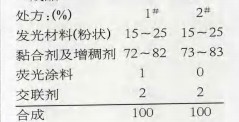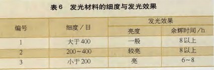1)發(fā)光材料是夜光印花漿的主要組分,實(shí)際上為蓄光物質(zhì)。用于紡織品上的蓄光物質(zhì)有兩種,一種為硫化物復(fù)合體,是高純度的硫化鋅摻入銅和鈷金屬。一 種為稀土金屬鹽,是由稀土離子激活的堿土金屬鋁酸鹽的復(fù)合體組成。蓄光體本身無毒,無揮發(fā)性氣體,用于紡織品印花的發(fā)光材料具有一定大小的顆粒質(zhì)(細(xì) 度),表6為各種細(xì)度的發(fā)光材料與發(fā)光效果。