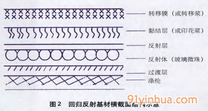 從圖2中可以看出,回歸反射基材不僅由很多材料復(fù)合而成,而且層與層之間排列非常平整,要使回歸反射效果好,具有良好的“鏡面”反射效果,一般反光 強(qiáng)度要大于10cd/m2。其中滌綸薄膜的平整度要好,過渡層的涂層厚薄要均勻一致,反射體必須整齊密集,反射層必須均勻完整,黏結(jié)層或印花漿要具有較好 的黏結(jié)牢度、延伸性、遮蓋性和手感,轉(zhuǎn)移膜或轉(zhuǎn)移漿要具有一定的延伸性,對大多數(shù)被轉(zhuǎn)移物要有良好的親和力,可黏結(jié)較廣泛的材料。