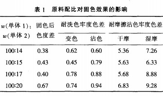 改變?cè)系呐浔,其它條件不變。所合成的固色劑的固色效果如表l所示。