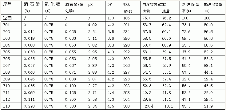 3.使用酒石酸和氯化鎂混合催化劑可以提高催化效果,但酒石酸的用量對織物強力影響較大,酒石酸/氯化鎂混合摩爾比在0.056時可獲得單獨使用氯化鎂時的最佳效果。
