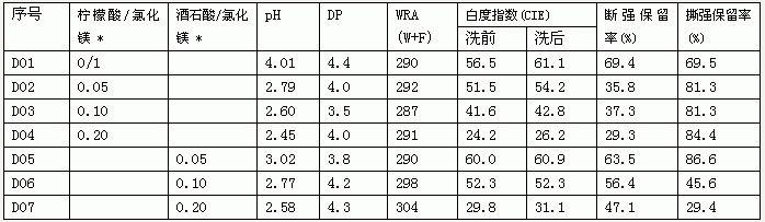 選擇檸檬酸和酒石酸與氯化鎂混合作為催化劑,比較它們的催化作用,試驗結(jié)果見表3。檸檬酸的酸性比酒石酸強,因此整理液pH要低,兩種活化劑得到的折皺回復(fù)性差不多,但DP等級均不如單獨使用氯化鎂的效果,且織物強力損失加大,故從本實驗結(jié)果看,單獨使用氯化鎂作催化劑較理想。