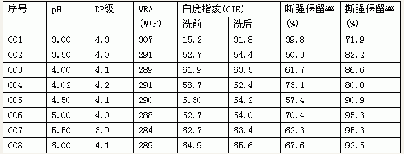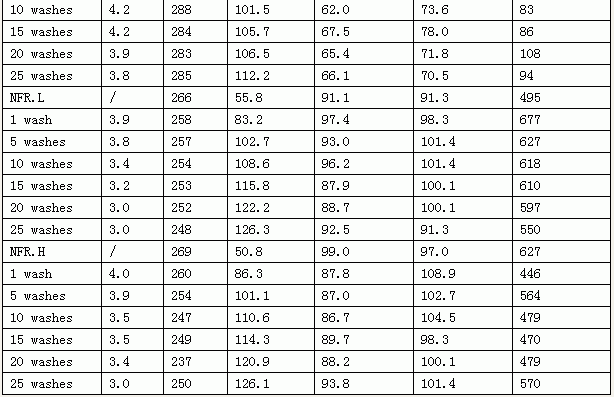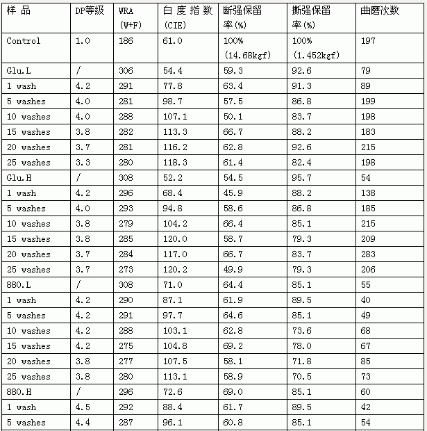 從試驗結(jié)果來看,DP等級為FREEREZ 880>戊二醛>FREEREZ NFR;折皺回復(fù)角為戊二醛>FREEREZ 880>FREEREZ NFR;水洗二十五次后戊二醛和FREEREZ 880的折皺回復(fù)角相仿,好于FREEREZ NFR;從白度情況看,F(xiàn)REEREZ 880均好于其他兩種整理劑,而強力保留率及耐洗磨性以 FREEREZ NFR和戊二醛較好,且前者好與后者。戊二醛整理時焙烘溫度160℃、焙烘時間為3分鐘的效果比焙烘溫度200℃、焙烘時間20秒要好。