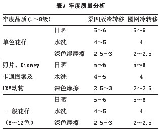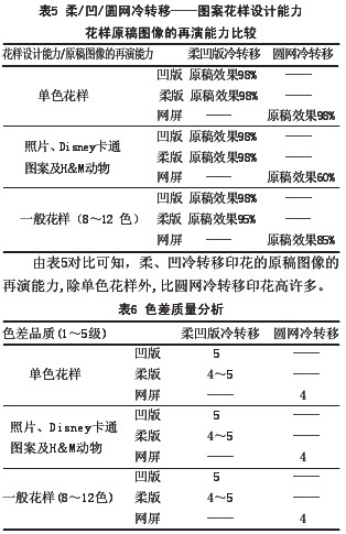 由表6色差質(zhì)量分析,柔、凹版冷轉(zhuǎn)移印花皆優(yōu)于圓網(wǎng)冷轉(zhuǎn)移印花。