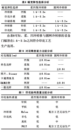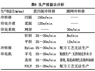 由表8可知,生產(chǎn)效益對比,冷轉(zhuǎn)移印花介質(zhì)印刷系統(tǒng),凹版、柔版與圓網(wǎng)產(chǎn)量比5:1、4:1;Cooltrans冷轉(zhuǎn)移印花機(jī)產(chǎn)量是丹麥聯(lián)合開發(fā)的轉(zhuǎn)移印花機(jī)2~3倍,紡織品種適應(yīng)范圍寬得多。