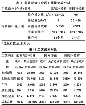 由表16可知,以常規(guī)圓網(wǎng)印花總成本為100%,則柔、凹版冷轉(zhuǎn)移印花是91%,圓網(wǎng)冷轉(zhuǎn)移印花是182.3%;三種印花工藝,由于冷轉(zhuǎn)移印花毋須蒸化,這樣烘干、固色成本僅為常規(guī)圓網(wǎng)印花的12.3%,萬米印花節(jié)省5700元;兩種冷轉(zhuǎn)移印花,由于圓網(wǎng)冷轉(zhuǎn)移印花介質(zhì)用得多,其成本是柔、凹版的297.4%,這樣令其總成本提高到柔、凹版的200%。