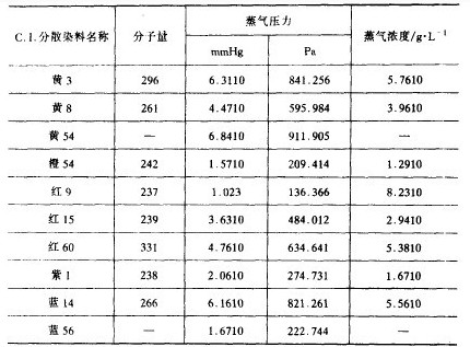 從表中可以看到,染料蒸汽濃度平均值在1.0~10g/L之間,因?yàn)榫埘ダw維能吸收約為重量10%的染料,進(jìn)而染料分配系數(shù)K較水溶液染色的分配系數(shù)值高得多。如此高的分配系數(shù),一旦氣化染料同纖維接觸,能很快被纖維表面吸收。