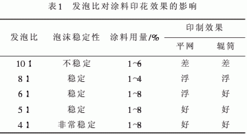 泡沫印花色漿的粘度與發(fā)泡比有密切的關(guān)系,發(fā)泡比就是發(fā)泡后泡沫體積與發(fā)泡前液體體積之比,發(fā)泡比與泡沫的密度有關(guān),泡沫的密度是泡沫單位體積的重量,用g/mL表示。比如:發(fā)泡前液體密度為1 g/mL,則空氣含量為零,假設(shè)發(fā)泡比為10∶1時(shí),說(shuō)明泡沫中含有9份的空氣和1份液體,其密度為0.1 g/mL。發(fā)泡比越高,泡沫的密度越低,粘度越高。在印花時(shí),發(fā)泡比對(duì)獲得滿意的印制效果具有很重要的作用,不同印花方式所需的發(fā)泡比也是不相同的,它還受到染料的種類(lèi)和濃度的影響,發(fā)泡比對(duì)涂料印制效果的影響,列在表1: