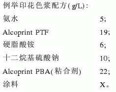 此色漿混合后其粘度約為5 Pa·s,從印漿與倍于體積的空氣混合產(chǎn)生發(fā)泡比為5∶1的泡沫,印制效果特別柔軟而清晰(發(fā)泡比對(duì)涂料印花效果的影響可參見(jiàn)前述表1中的結(jié)果)。