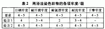 染色采用兩浴法,其各項牢度如表2所示。表2表明,使用分散/活性染料工藝染地,由于活性染料中大部分品種耐汗?jié)n牢度、耐氯漂牢度和日曬牢度較差,而且個別染料耐氯漂牢度很差,使用效果很不理想,因此不宜采用分散/活性工藝染底印花方式。
