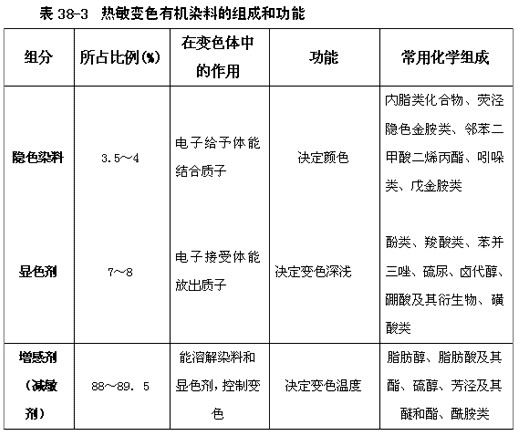 【集萃網(wǎng)觀察】熱敏變色有機(jī)染料是有隱色染料、顯色劑的增干劑(減敏劑)三部分組成,其化學(xué)組成和作用見表38-3: