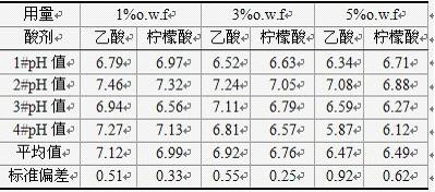 從表1可以看出,漂白織物pH值、平均值與標(biāo)準(zhǔn)偏差值均隨酸劑用量增大而呈現(xiàn)逐漸減小的趨勢(shì),說明隨著酸劑用量的增加,漂白織物pH值變化增大且標(biāo)準(zhǔn)偏差升高。其中,檸檬酸的pH值變化幅度較小,標(biāo)準(zhǔn)偏差也相對(duì)較低,故檸檬酸對(duì)pH值的穩(wěn)定性控制比乙酸好。如果酸量過大,則在漂白織物降低pH值的同時(shí)易變灰,其白度和色光難以控制,因此,綜合生產(chǎn)成本與表1測(cè)試數(shù)據(jù)得出,酸劑推薦用量為3%o.w.f較適宜。