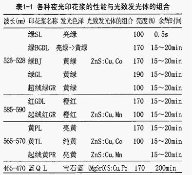 根據(jù)原料、經(jīng)濟(jì)和技術(shù)三方面的因素,目前新研制成十種夜光印花漿,絕大部分已用于生產(chǎn)。各種夜光印花漿的性能與光致發(fā)光體的組合,如表1-1